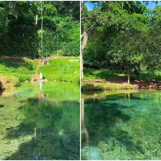 As imagens revelam um poço de água cristalina formado em trecho de rio cercado por vegetação nativa e formações rochosas. Sem estrutura turística formal, o local tem atraído visitantes em busca de contato direto com a natureza.